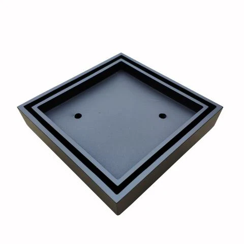 Modern compact square tile insert grate, in high grade brass coded in black colour. Allows for discreet waterproof installation and easy removal for cleaning.